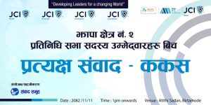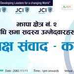 नेपाल जेसीजको परिपत्रअनुसार तथा संवाद समूह झापाको सहजीकरणमा कार्यक्रम भोलि फागुन ११ गते दिउँसो १ बजे बिर्तामोडस्थित अतिथि सदनमा आयोजना हुने आयोजकले जनाएको छ।