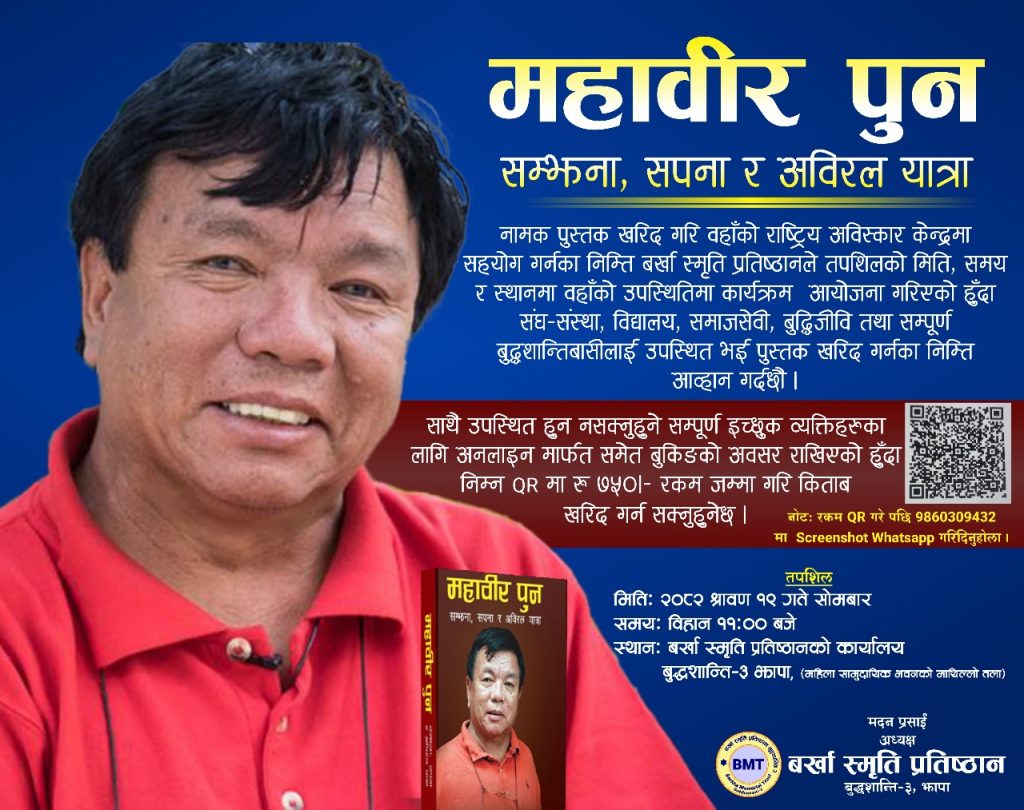 आफ्नो पुस्तक बिक्रीगर्न राष्ट्रिय आविष्कार केन्द्रका संस्थापक महावीर पुन बुद्धशान्ति आउने भएका हुन । बुद्धशान्ति ३ स्थित महिला सामुदायिक अस्पताल भएको घरको माथिल्लो तलामा रहेको बर्खा स्मृतिको आफ्नै कार्यालयको सभाहलमा महावीर पुन आउने बर्खा स्मृति प्रतिष्ठानका अध्यक्ष मदन प्रसाईले जानकारी दिनु भयो ।
